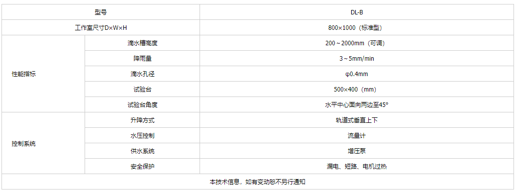 產(chǎn)品簡介:滴水試驗裝置/滴水試驗箱(Drip box) , 滴水試驗裝置適用于外部照明和信號裝置及汽車燈具外殼防護。箱體結(jié)構(gòu):固定立柱,柱型升降導軌,滴水箱,水位調(diào)節(jié)供水箱,自動升降機,流量計,濾紙,可調(diào)角度工作臺,電器控制箱等組成。