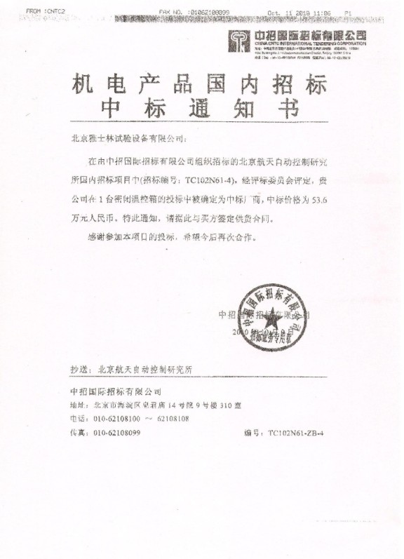 金秋十月,秋高氣爽!由中招國際招標(biāo)有限公司精心組織,在北京航天自動控制研究所2010年國內(nèi)項(xiàng)目二期招標(biāo)中,北京雅士林試驗(yàn)設(shè)備有限公司憑借強(qiáng)大的綜合實(shí)力,以各項(xiàng)排名指標(biāo)均名列前茅的優(yōu)異成績成功中標(biāo)密閉溫控箱(招標(biāo)編號:TC102N61-4)項(xiàng)目工程。中標(biāo)金額為53.6萬元人民幣。 北京航天自動控制研究所2010年密閉溫控箱工程項(xiàng)目是該所2010年的重點(diǎn)項(xiàng)目。該項(xiàng)目的成功中標(biāo)進(jìn)一步確立了北京雅士林環(huán)境試驗(yàn)設(shè)備在航天市場的領(lǐng)先地位,也為北京雅士林的的持續(xù)發(fā)展樹立了堅實(shí)的信心。在環(huán)境試驗(yàn)設(shè)備市場競爭空前激烈的情況下,北京雅士林以有效的資源投入、專注的研發(fā)、前瞻的設(shè)計理念、嚴(yán)謹(jǐn)科學(xué)的生產(chǎn)管理制度、及時高效專業(yè)的工程服務(wù)隊伍換來了在技術(shù)、產(chǎn)品、市場各方面的良好口碑,并取得了優(yōu)異的市場成績。