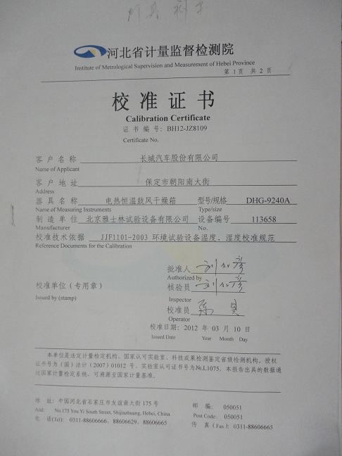 電熱恒溫鼓風(fēng)干燥箱校準(zhǔn)證書-河北計(jì)量院-長(zhǎng)城汽車
