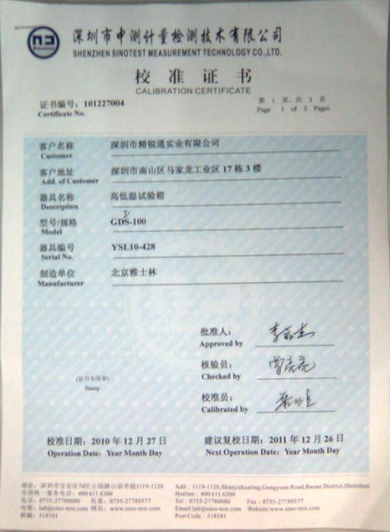 >>高低溫交變濕熱試驗箱校準(zhǔn)證書-深圳中測計量-深圳精銳通