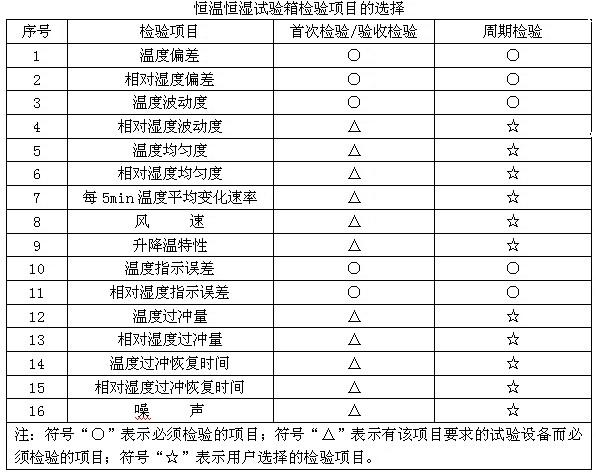 恒溫恒濕試驗(yàn)箱首次檢驗(yàn)/驗(yàn)收檢驗(yàn)和周期檢驗(yàn)時(shí),若無其他規(guī)定,按下表選擇檢驗(yàn)項(xiàng)目。