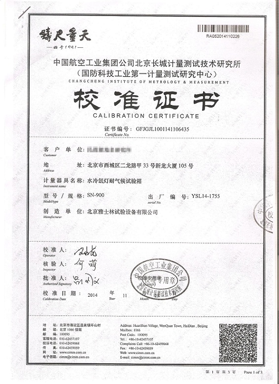 ·氙燈老化試驗(yàn)箱校準(zhǔn)證書(shū)模板下載—北京長(zhǎng)城計(jì)量所