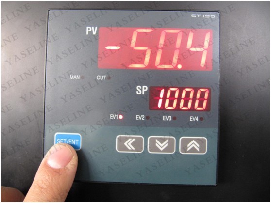 3、打開控制器按“SET/ENT”按鍵,SV顯示值光標(biāo)閃爍,再點擊“上下標(biāo)志圖”,設(shè)定所需溫度,再按“SET/ENT”進(jìn)行確認(rèn)。